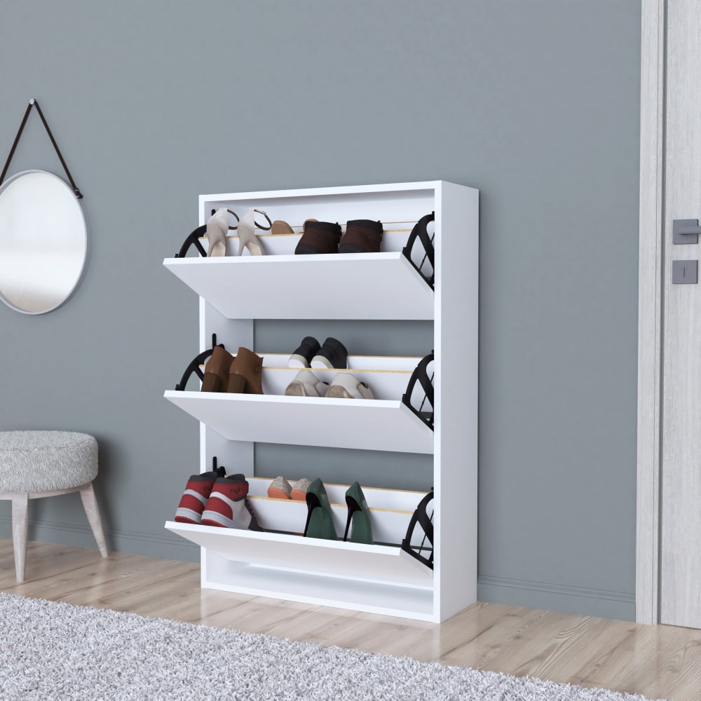 Der moderne Schuhkipper verfügt über drei Kipptüren und bietet Ihnen die ideale Lösung zur platzsparenden Aufbewahrung Ihrer Schuhe. Mit seinem ansprechenden Design wird er zum Blickfang in jedem Raum.
