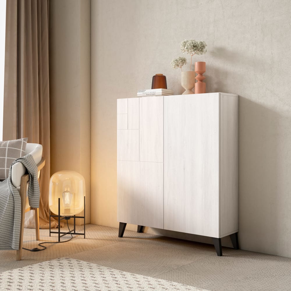 Dieses elegante Möbelstück in Holzoptik Melamin ist die perfekte Antwort für alle, die Funktionalität suchen, ohne auf Stil zu verzichten. Kompakt, aber mit großer Kapazität, verbindet es klare Linien mit einer warmen und natürlichen Ästhetik, die jede Ecke in einen geordneten, einladenden und charaktervollen Raum verwandelt. Die Harmonie zwischen dem Möbelkörper und den keilförmigen Beinen macht dieses Möbelstück zu einem unverzichtbaren Aufbewahrungselement, das sich nahtlos in den Raum einfügt. Ideal als Schuhschrank, Eingangsmöbel oder Sideboard, bietet es eine intelligente Aufbewahrungslösung für alle, die mehr Ordnung, mehr Stil und mehr Harmonie zu Hause wollen.Eigenschaften :Materialien: Struktur und Türen aus Melamin und Beine aus lackiertem massivem Buchenholz.Zertifizierung: FSC, PEFC.Herstellung: Spanien.4 vielseitige Einlegeböden (geneigt oder horizontal einsetzbar).Kapazität: 1820 Paar.Rückwand zum Verschließen des Möbels und zum Schutz der Wand vor Flecken.Die aus vernickeltem Stahl gefertigten Scharniere verfügen über eine Soft-Close-Funktion, um Türschläge zu vermeiden.Modell niedrig: Bergen 512.Möbel zur Selbstmontage mit Montageanleitung in 2 Paketen verkauft.Pflegehinweis :Mit einem trockenen oder leicht feuchten Tuch und geeigneten Holzpflegemitteln reinigen (ein zu nasses Tuch kann Schäden verursachen).Allgemeine Abmessungen :Höhe: 109cm.Länge: 90cm.Tiefe: 27cm.Gewicht: 35kg.Spezifische Abmessungen :Höhe jedes Fachs: 17cm.Innenlänge: 87cm.Innentiefe: 23cm.Tiefe der Einlegeböden: 23cm (horizontal) und 31cm (geneigt).Beinhöhe: 12cm.