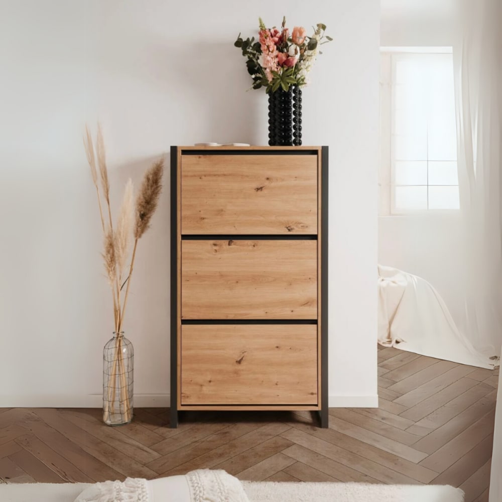 Schuhschrank mit 3 Klappen L70 cm – Dekor Eiche und Grau von Calicosy