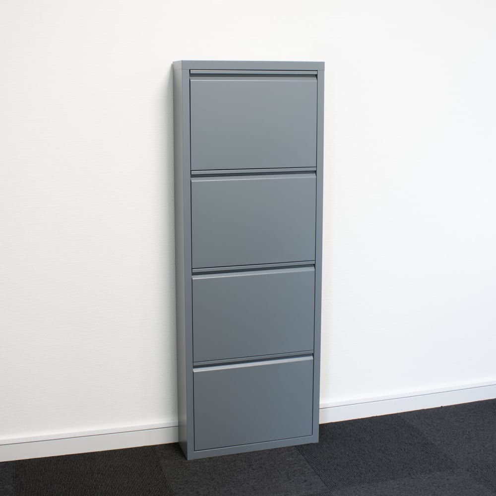 Schuhschrank Pisa mit 8 Türen in Metallgrau. Komplett montiert wird ein Schuhschrank in der Farbe Grau geliefert, der sowohl Stil als auch Funktionalität in Ihr Zuhause bringt. Komplett montiert geliefert. RAL 7031 grau. Schublade innen: B46/L29/T13 cm. Kann auf den Boden gestellt oder an die Wand gehängt werden. Einzeln verwendbar. Türen öffnen sich gleichzeitig. Dieses Produkt wurde mit viel Liebe zum Detail hergestellt, was sowohl Ästhetik als auch hohe Haltbarkeit gewährleistet. Bei der Gestaltung wurde sowohl auf Funktionalität als auch auf Stil geachtet, was es zur perfekten Wahl für jeden Raum in Ihrem Zuhause macht. Die verwendeten Materialien sind von hoher Qualität, was dem Produkt eine lange Lebensdauer verleiht und dafür sorgt, dass es dem täglichen Gebrauch standhält. Ob zur Aufbewahrung oder als dekorative Ergänzung, dieses Produkt wertet Ihre Einrichtung auf und bringt zusätzlichen Komfort und Eleganz in Ihr Zuhause.