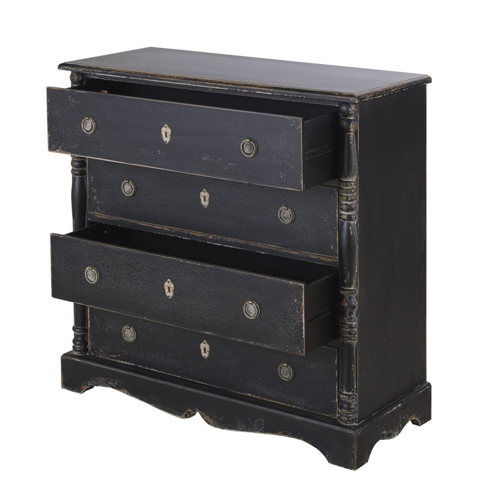 Setzen Sie auf die Authentizität der schwarzen Kommode LOUISA mit 4 Schubladen aus messingfarbenem Metall! Die dunkle Farbe und die gealterte Optik machen diese Kommode zu einem echten Charakterstück, das alle Blicke auf sich ziehen wird. Der klassische Stil gibt der Dekoration den Ton an und die obere Platte kann sowohl eine Lampe als auch eine Figur aufnehmen. Mit ihren 4 Schubladen bietet diese Kommode viel Platz für die Aufbewahrung Ihrer Kleidung. Uns hat dieses Möbelstück voll überzeugt!