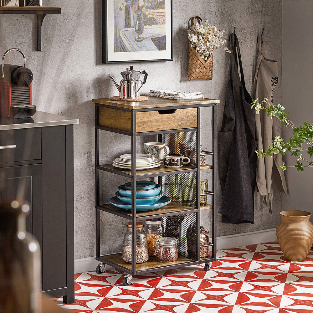 Diese kleine Schublade ist ideal für Geschirr und trockene Handtücher. Wo er am meisten benötigt wird, erscheint dieser Servierwagen dort.
