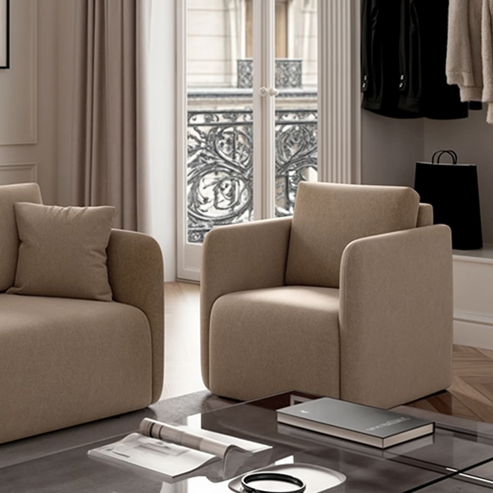 Entdecken Sie französische Eleganz mit der Rodier Chaum Kollektion, die minimalistisches Design auf raffinierte Funktionalität trifft. Dieser kompakte Sessel zeichnet sich durch niedrige Beine und schlanke, elegante Seitenwände aus und schafft so eine luftige Silhouette, die perfekt in jedes moderne Interieur passt. Er bietet dauerhaften Komfort und vereint Funktionalität und Eleganz. Jedes Stück der Chaum Kollektion ist aus luxuriösen, samtig anmutenden Stoffen oder einem markanten Fischgrätmuster gefertigt und sorgt für ein ebenso edles wie langlebiges Haptikerlebnis.