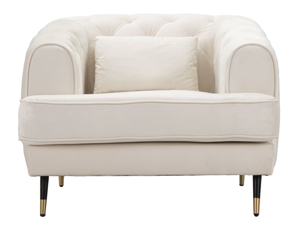 Beige gepolsterter Sessel aus Polyester mit Armlehnen, bequemer gesteppter Rückenlehne und Holzbeinen mit goldener Metallverkleidung. Das Kissen, aus dem der Sitz besteht, ist abnehmbar. Komplett mit rechteckigem Kissen. Maße: cm 93x86x71. Gewicht ca. 120 kg. Zur Reinigung ein feuchtes Tuch oder Dampf verwenden. Produkt zu montieren.