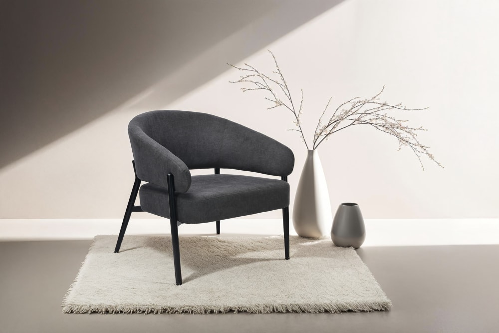 • Der JOHN Sessel in elegantem Dunkelgrau kombiniert hochwertigen Webstoff mit einem schwarzen Stahlgestell für ein modernes Design.