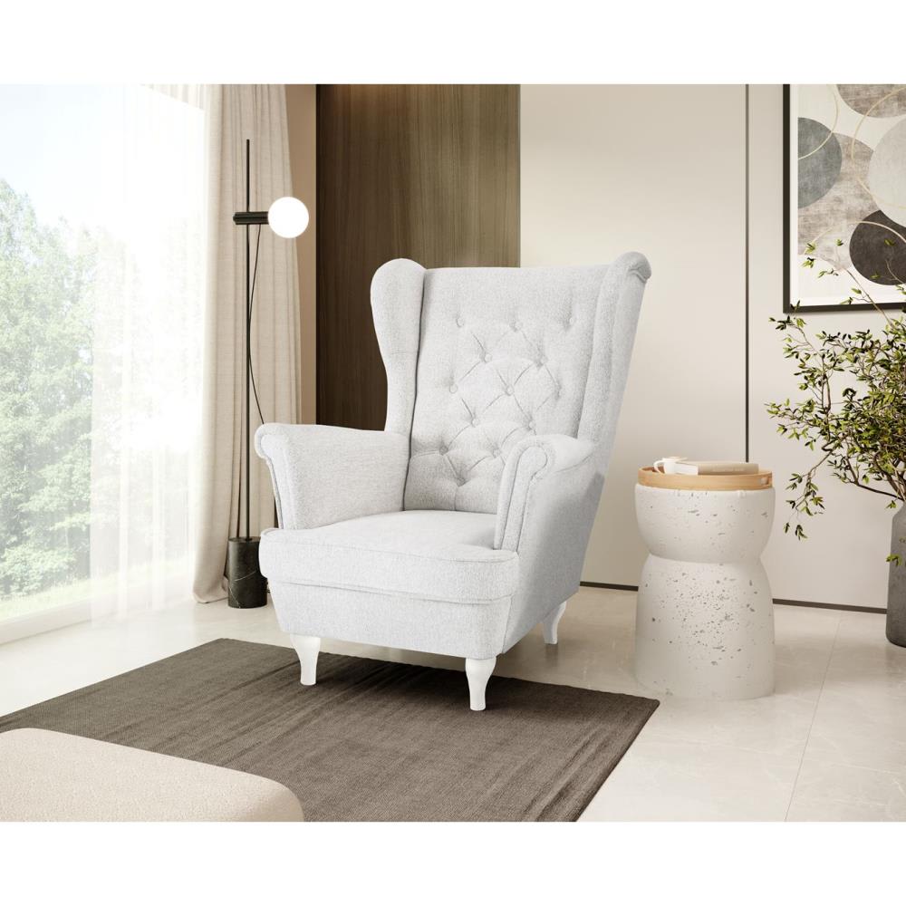 Sessel hellbeige mit Weiß Holzbeinen, Bouclé-Stoff von Beauty Sofa GmbH