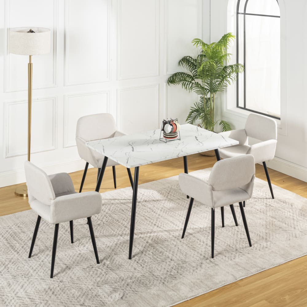 Set aus Tisch mit weißem Marmoreffekt und 4 Stühlen aus beigem Stoff von Urban Meuble