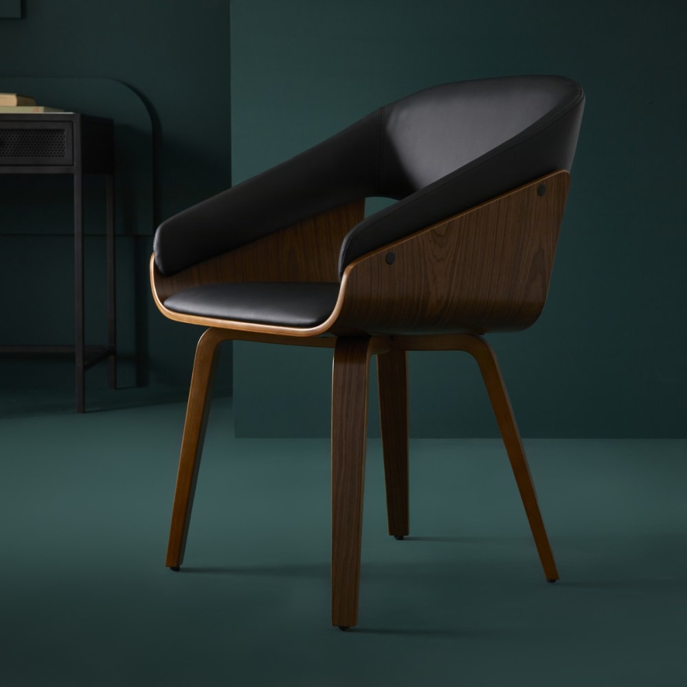 Stuhl mit Armlehnen aus Sperrholz mit Nussbaum-Finish.