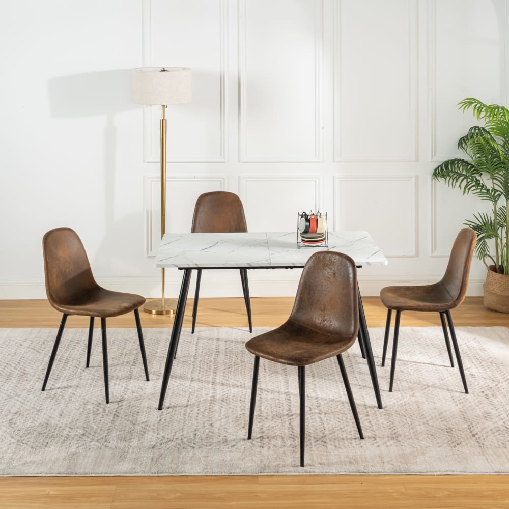 Moderner und eleganter Stil: Dieser weiße Esstisch verfügt über ein Marmor-Effekt-Design und schwarze Beine, zusammen mit den Retro-Look-Stühlen und ihrem weichen Wildleder-/Wildleder-Effekt-Stoff verleihen diese raffinierte Kombination und ihre klaren Linien Ihrem Wohnraum einen Hauch von Vintage-Charme Raum.