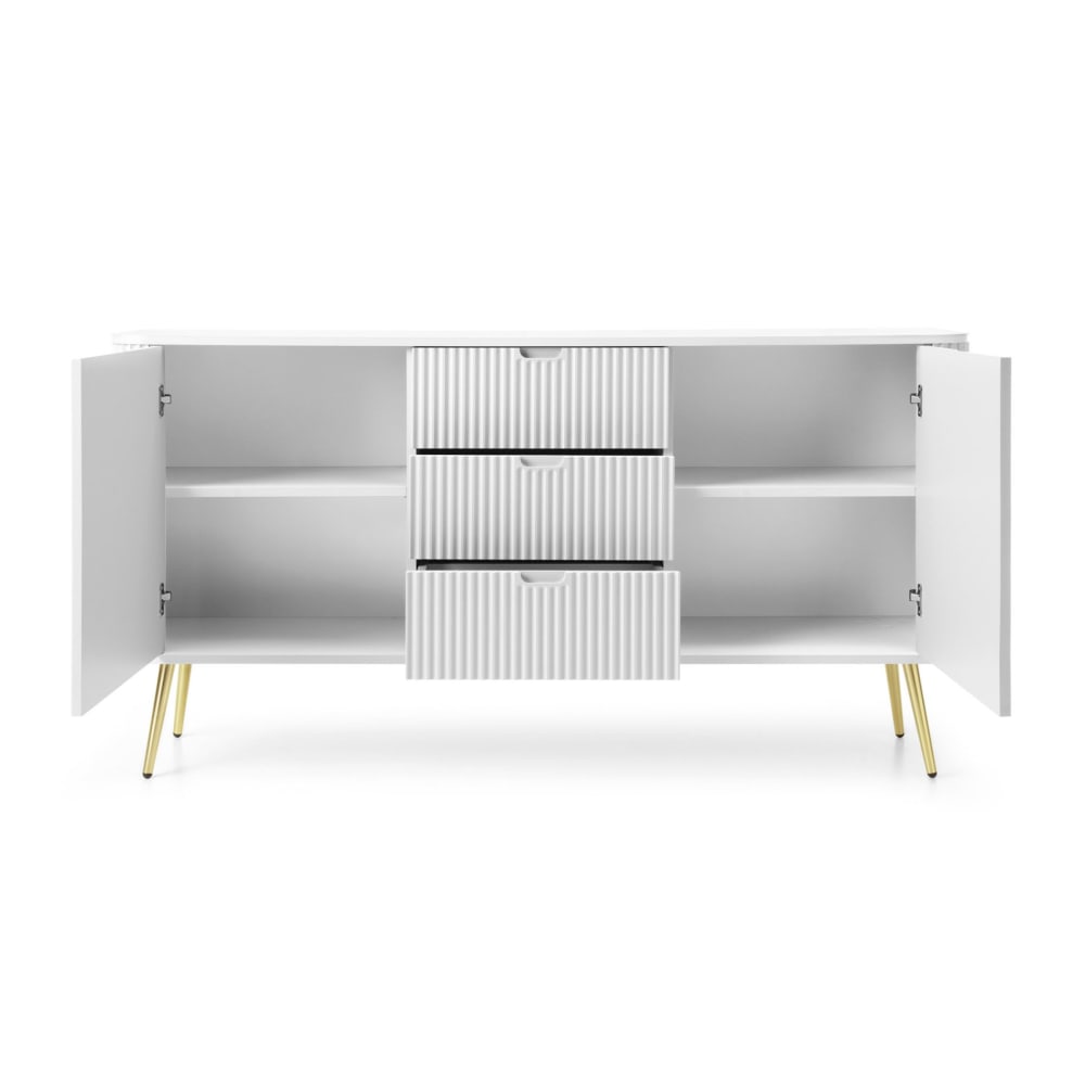 Drei geräumige Schubladen und drei Fächer mit Einlegeböden bieten reichlich Platz für Bücher, Geschirr, Accessoires, Dokumente oder andere Gegenstände. Dieses Sideboard hilft Ihnen, Ihr Zuhause stilvoll und ordentlich zu gestalten.