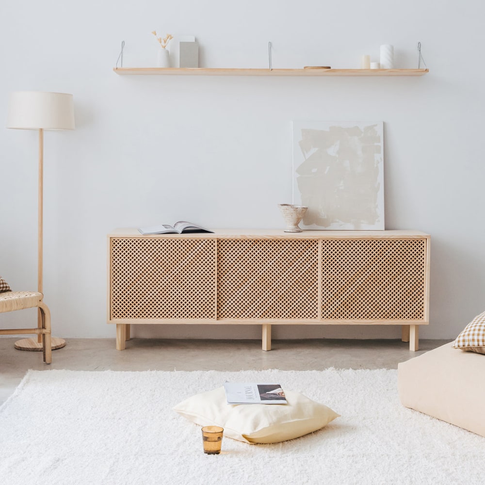 Sideboard Altea aus massivem, natürlichem Kiefernholz. Durch sein schlichtes Design passt es zu jedem Stil und sein großes Fassungsvermögen macht es leicht, Ordnung zu halten.