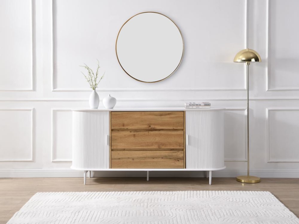 Die Kollektion VELURANI bietet eine raffinierte Ästhetik mit ihren Schiebetüren in Rillen-Optik, die Ihrem Interieur Einzigartigkeit verleihen. Die Kombination von Weiß und Holzfarben schafft eine helle und warme Atmosphäre, die typisch für den modernen Stil ist. Diese Kollektion ist auf Langlebigkeit ausgelegt und bietet praktischen Stauraum, der für eine optimale Organisation im Alltag konzipiert wurde.Produktdetails Farbe (Schattierungen): Weiß, Naturfarben hell Material: MDF Material (Füße): Metall Finish: Matt 2 Türen Schiebetür Aufbau / Stauraum: 3 Schubladen Ausziehschublade Verlegeart: Auf dem Boden aufzustellen Maximale Traglast: 75 kg Produkt zum Selbstaufbau : Maximale Traglast der Schubladen: 20 kgCa.-Maße Breite: 170 cm Höhe: 81 cm Tiefe: 40 cmVersanddetailsLieferzeit und Versandkosten werden Ihnen auch in Ihrem Warenkorb angezeigt.Bitte überprüfen Sie bei der Annahme der Lieferung die Anzahl der Pakete.PaketPaket Nr.1: Breite 180 cm, Tiefe 50 cm, Höhe 13 cm, Gewicht 39 kg, Paket Nr.2: Breite 72 cm, Tiefe 44 cm, Höhe 15 cm, Gewicht 15 kg,