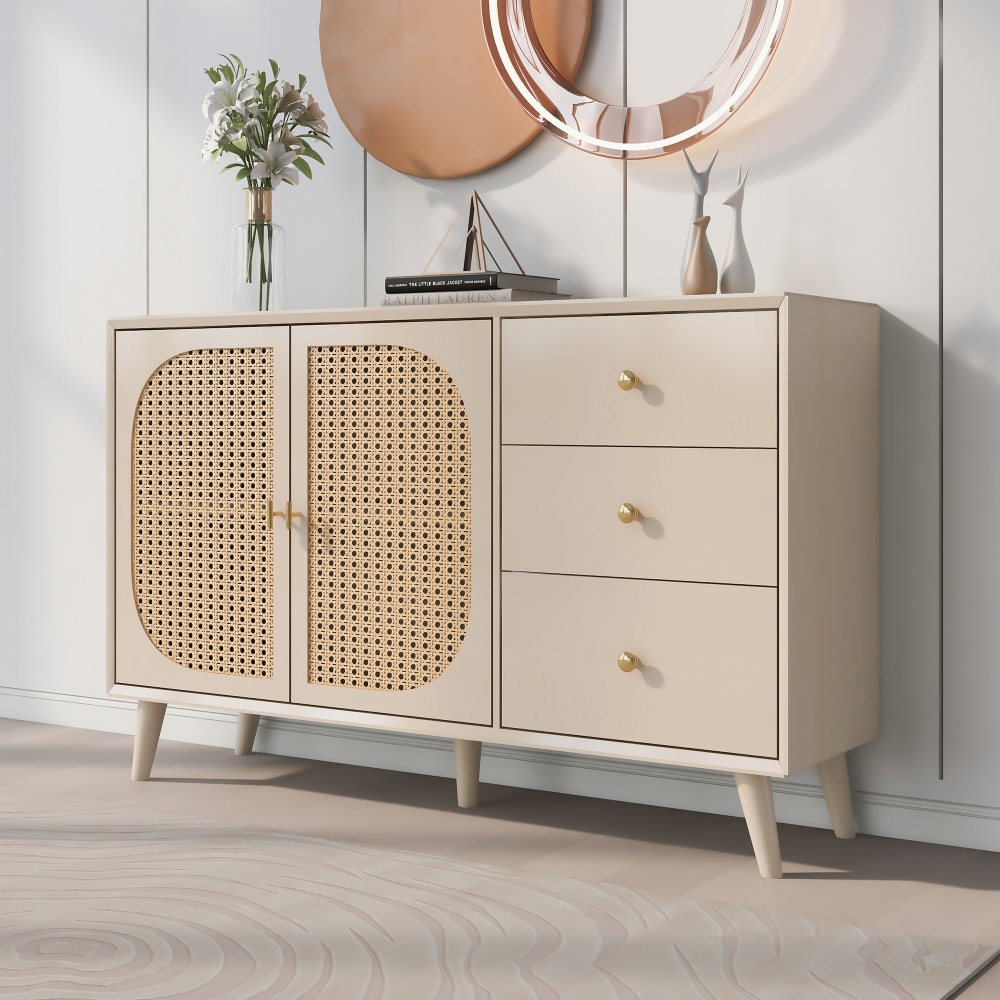 SHAIZON Sideboard in cremeweißer Holzoptik mit Türen in Rattangeflecht und 3 Schubladen