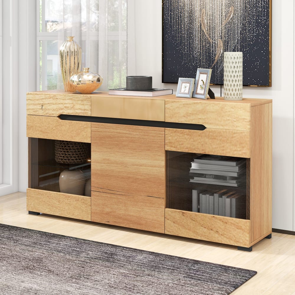 Dieses hochwertige LED-Sideboard-Set mit Naturholzeffekt ist die perfekte Lösung für eine stilvolle Aufbewahrung mit moderner Beleuchtung. LED-Leuchten verleihen Ihrem Raum eine warme Atmosphäre und heben Ihre Objekte hervor.