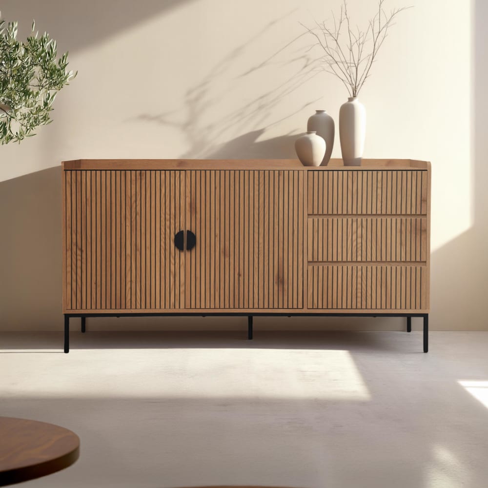 Entdecken Sie dieses robuste Sideboard, das sowohl Funktionalität als auch modernes Design vereint und so konzipiert ist, dass es sich perfekt in Ihr Interieur einfügt. Dank seiner großzügigen Abmessungen ist dieser Aufbewahrungsschrank mit zwei Türen und drei Schubladen ausgestattet und bietet so viel Stauraum für Ihre persönlichen Gegenstände. Dieses aus MDF mit Melamindekor gefertigte Sideboard zeichnet sich durch sein elegantes und langlebiges Aussehen aus und ist kratz- und feuchtigkeitsbeständig, was es zu einer klugen Wahl für den täglichen Gebrauch macht. Die Stahlbeine und passenden Griffe verleihen seiner Ästhetik eine moderne Note und sorgen gleichzeitig für optimale Robustheit und Stabilität. Der gut ausgestattete Innenraum verfügt über verstellbare Regale hinter den Türen, sodass Sie Ihre Gegenstände ganz einfach nach Bedarf organisieren können. Die tiefen und geräumigen Schubladen bieten zusätzlichen Stauraum für kleine Gegenstände und sorgen dafür, dass Ihr Raum aufgeräumt und stilvoll bleibt.Abmessungen: Höhe 80 cm, Tiefe 40 cm und Länge 150 cm.< /p>