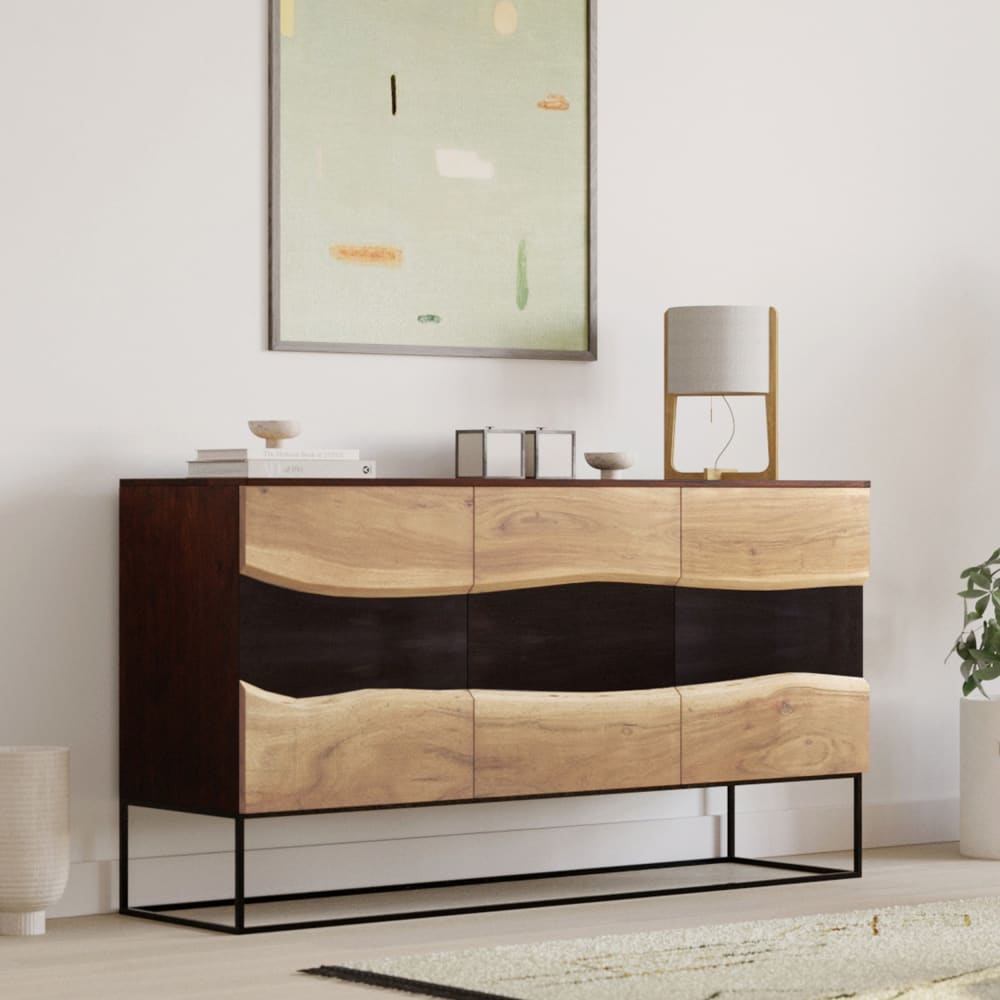 Alabama – Sideboard aus Holz und schwarzem Metall – Mögen Sie Möbel mit edlem Aussehen und großer Originalität? Dann werden Sie unser Alabama-Sideboard aus Holz und schwarzem Metall lieben, das ebenso kunstvoll wie funktional ist. Sobald unser Alabama-Sideboard aus Holz und schwarzem Metall in Ihrem Wohnzimmer installiert ist, wird es zu einem Highlight Ihrer Einrichtung. Sie werden sofort von den großzügigen Proportionen (L 150 x T 45 x H 82 cm) begeistert sein, die ihm eine starke Persönlichkeit verleihen. Auf einem Metallsockel mit einer Höhe von 22 cm wird es einen großen Eindruck hinterlassen. Unser Sideboard Alabama aus Akazienholz in mehreren Farbtönen aus Holz und schwarzem Metall verleiht Ihrem Interieur eine grafische Note. Besonders schätzen werden Sie die dynamische Wellenbewegung, die an der Vorderseite seiner drei Türen im Format 49,5 x 60 cm verläuft. Dank unseres Alabama-Sideboards aus Holz und schwarzem Metall können Sie so viel Stauraum verstauen, wie Sie möchten. Sein Fassungsvermögen ist ideal für die Aufnahme und den Schutz Ihres Geschirrs und Ihrer Haushaltswäsche. Durch die Kombination eines praktischen Aspekts mit einer unwiderstehlichen Silhouette wird es mit Sicherheit zu Ihrem Must-have für Eleganz. Wenn Sie ein Fan von modernem High-End-Design sind, geben Sie schnell eine Bestellung auf, um diesen außergewöhnlichen Neuzugang in unsere Kollektionen aufzunehmen.-Abmessungen : Länge: 150 cmTiefe: 45 cmHöhe: 82 cmHöhe der Füße: 22 cmTür (x3): 49.5 x 58.5 cmEinlegeböden (x2): 96 x 28 cmRegale (x2): 48.5 x 28 cmStärke des Tabletts: 2 cmMaterialien: Akazienholz und MetallZusätzliche InformationenDie Farbe des Holzes, das für die Herstellung dieses Sideboards verwendet wird, kann von einem Produkt zum anderen variieren, da jedes Massivholzbrett einzigartig ist und von zahlreichen Faktoren abhängt, die die endgültige Farbe beeinflussen können (Äste, Schnittplan, Trocknung…).Vermeiden Sie es, das Möbelstück in der Nähe einer Wärmequelle oder an einem feuchten Ort aufzustellen.Die Farbe des Holzes bildet mit der Zeit und unter Lichteinwirkung eine Patina.Max. Gewicht: 40