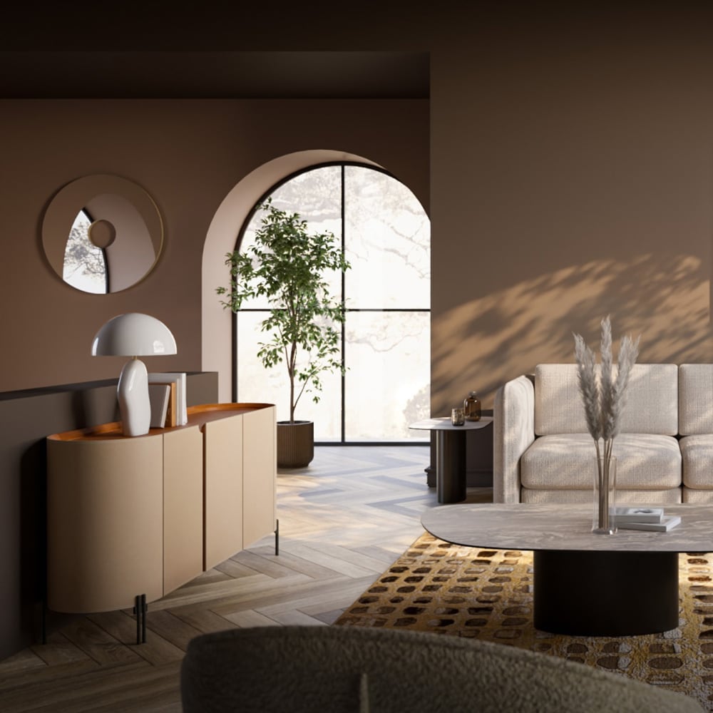 Das Sideboard Tango verbindet modernes Design mit außergewöhnlichen Materialien ideal für stilbewusste Wohnräume. Mit einer kompakten Breite von 150 cm (75 x 150 x 40 cm) passt es perfekt auch in kleinere Wohnzimmer oder Flure. Besonders edel wirkt die Bespannung der Front mit glattem, beschichtetem Textil in Lederoptik. Weiße Kontrastnähte an den Rändern setzen elegante Akzente und betonen die hochwertige Verarbeitung. Die schlanken, lackierten Stahlfüße verleihen dem Möbelstück Leichtigkeit und modernen Charakter.