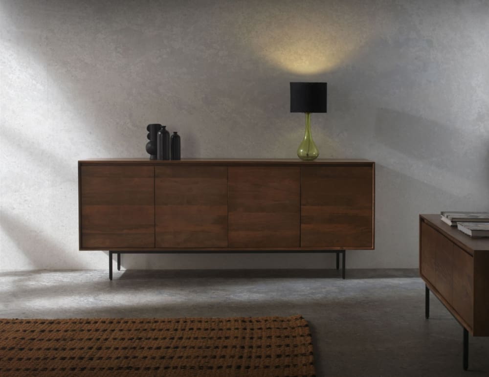 Dieses Lowboard mit drei glatten Türen besteht aus massivem, naturbelassenem Mangoholz, wodurch es eine warme und natürliche Optik erhält. Die Türen lassen sich mit einer Griffmulde öffnen und verfügen über Soft-Close-Scharniere für mehr Komfort beim Öffnen und Schließen. Im Inneren befindet sich hinter den Türen mittig ein Einlegeboden, auf dem Sie Gegenstände ordentlich organisieren und verstauen können. Das Lowboard hat einen 18 cm hohen schwarzen Metallfuß, der für Stabilität sorgt und dem Design einen modernen Touch verleiht. Außerdem muss dieses Möbelstück nicht montiert werden, es muss lediglich der Metallfuß angebracht werden. Fazit: Dieses Lowboard aus massivem Mangoholz ist ein elegantes und funktionales Möbelstück, das jedem Raum in Ihrem Zuhause einen stilvollen Touch verleiht und Ordnung schafft.