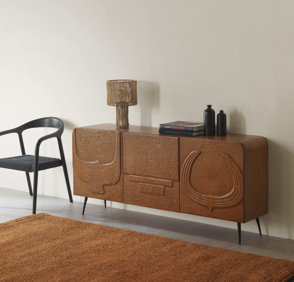 Der 3-türige Sideboard in Honigfarbe aus massivem Mangoholz hat ein rechteckiges Design mit leicht abgerundeten Ecken, die ihm eine weiche Optik verleihen. Die strukturierte Front mit fantasievollem Relief verleiht ihm eine unverwechselbare und elegante Note. Jede der drei unabhängigen Türen verfügt über sanft schließende Scharniere und einen sicheren Magnetverschluss, der das Öffnen und Schließen erleichtert. Im Inneren befindet sich ein feststehender Einlegeboden in 26 cm Höhe, der sich ideal zur Organisation eignet. Die 17 cm hohen schwarzen Metallfüße mit Höhenverstellung heben das Möbelstück an und stabilisieren es. Es ist keine zusätzliche Montage erforderlich, da nur die Füße mit den mitgelieferten Schrauben angebracht werden müssen.