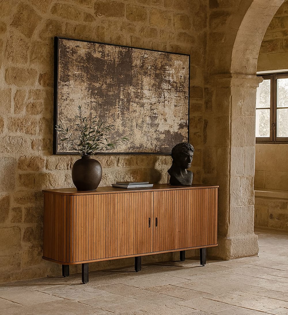 Sideboard aus der BARCELONA-Kollektion, gefertigt aus massivem Akazienholz in Beige, kombiniert mit eleganten schwarzen Eisenbeinen, die einen modernen und raffinierten Kontrast schaffen. Das Design besticht durch sanfte Linien und geschwungene Formen, die jedem Raum eine warme und einladende Atmosphäre verleihen. Ausgestattet mit Lamellentüren zum Schieben, verleiht es dem Möbelstück einen einzigartigen und charakteristischen Stil. Im Inneren befindet sich ein Regal zur effizienten Aufbewahrung und Organisation. Ideal, um Wohnzimmern, Essbereichen oder Arbeitsräumen Charakter und Funktionalität zu verleihen. Handgefertigtes Unikat mit möglichen Variationen, die die Einzigartigkeit des Stücks unterstreichen. Produktgewicht: 67 kg. Montage erforderlich.