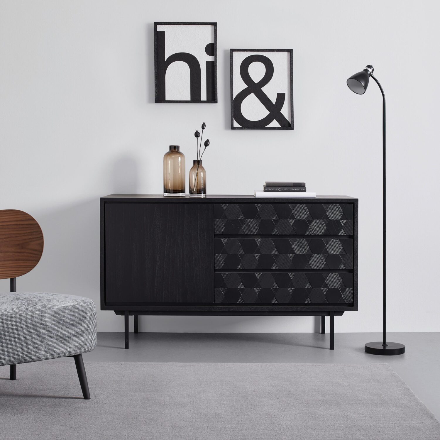 Dieses Sideboard in Schwarz besticht durch eine stylische Optik mit einer strukturierten Front, die dem Möbelstück eine ganz besonders attraktive Note verleiht. Das ca. 131,5 x 77 x 42 cm (B x H x T) große Sideboard aus MDF und Echtholz furniert verfügt über 3 Schubladen, sowie 1 Drehtür, hinter der sich 1 Einlegeboden befindet. Laden und Türen sind grifflos zu öffnen. Weiters kann das schicke Sideboard mit eckigen Metallbeinen für optimale Stabilität punkten. Es ist bis max. 30 kg belastbar und eine tolle Ergänzung für viele Wohnbereiche. HINWEIS Dieser Artikel wird in unseren Filialen nicht ausgestellt, ist dort jedoch einfach und bequem bestellbar und wird direkt zu Ihnen nach Hause geliefert. Bitte beachten Sie, dass die abgebildete Dekoration im Lieferumfang nicht enthalten ist.