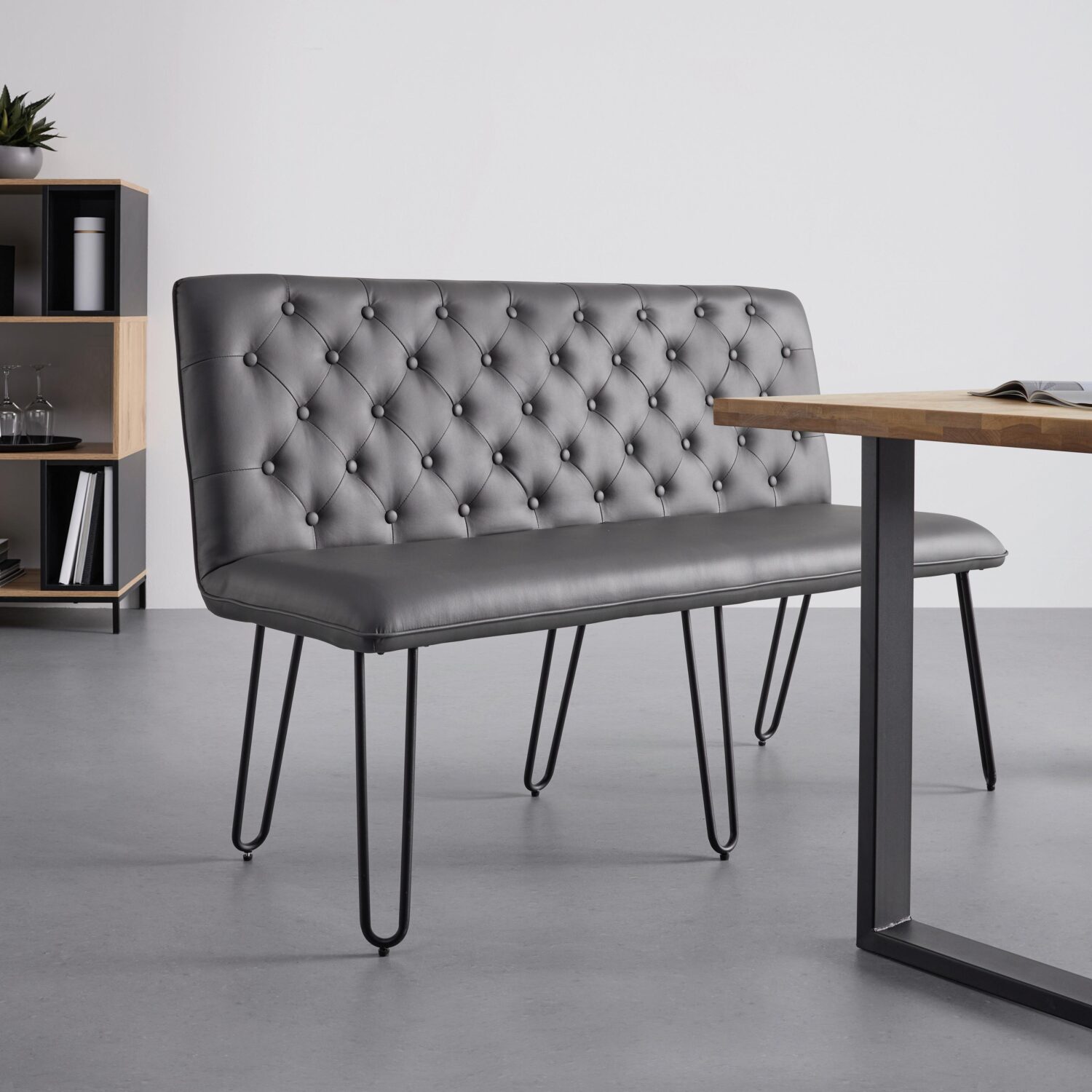 Mit dieser schicken Sitzbank in Grau holen Sie sich einen gemütlichen Sitzplatz in Ihr Zuhause. Der edle Bezug im Lederlook erhält durch die dekorativen Knöpfe im Bereich der Rückenlehne einen ganz besonderen Charme. Die ca. 140 x 92 x 62 cm (B x H x T) große Sitzbank steht auf filigranen und doch sehr stabilen Metallbeinen in Schwarz und ist mit einer weichen Schaumstoffpolsterung für optimalen Sitzkomfort ausgestattet. Sie ist bis max. 140 kg belastbar. HINWEIS Bitte beachten Sie, dass die abgebildete Dekoration im Lieferumfang nicht enthalten ist.