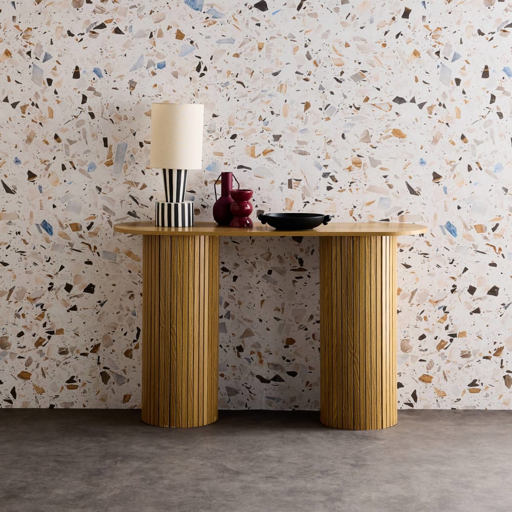 Bringen Sie mit der ovalen Konsole Legacy eine Nuance von Raffinesse in Ihr Interieur, perfekt um die Ästhetik eines Eingangsbereichs zu verbessern oder eine leere Wand zu schmücken. Dieses Möbelstück im skandinavischen Design besticht durch seine ovale Platte und seine runden Beine, beide aus hochwertigen, gerillten Holzlook-Laminatplatten.