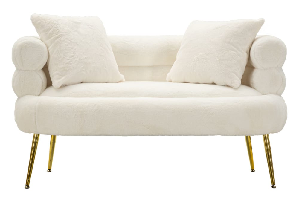 Weißes Zweisitzer-Sofa mit goldenen Beinen zum Zusammenbauen, bezogen mit weichem Kunstfell. Ideal für moderne und raffinierte Umgebungen, verleiht es einen Hauch von Luxus und Komfort. Komplett mit 2 quadratischen Kissen. Abmessungen 133x68x69 cm. Maximale Traglast 200 kg. Verwenden Sie zum Reinigen ein feuchtes Tuch oder Dampf.