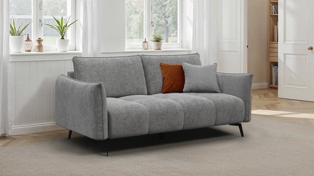 Sofa 2,5-Sitzer AERA, platingrau. Maße: 187 x 89 x 96 cm, 49 kg. Sitzhöhe: 45 cm, Sitztiefe: 57 cm. Anzahl der Pakete: 1 St. 190x99x57cm / 53kg. Keine Montage erforderlich. Die Füße: 16 cm, schwarz. Stoff: Ein Veloursstoff mit kurzem Flor und einer zarten, ungleichmäßigen Struktur. Die Oberfläche ist weich und angenehm und fühlt sich auf der Haut angenehm warm an. Je nach Lichteinfall schimmert der Stoff subtil und verändert seine Farbe (Schattierungseffekt). 100% Polyester, 400 g/m2, 50.000 Martindale, pilling resistance: 4, lightfastness: 21, platingrau. Design von Weltklasse. Einzigartiger Stil, ideal für moderne, industrielle, minimalistische und skandinavische Innenräume. Die Serie AERA zeichnet sich durch ihre klare, minimalistische Form aus, die sich perfekt in die Ästhetik moderner, heller Innenräume einfügt. Die niedrige Rückenlehne, die subtil abgerundeten Linien und die schlanken Metallbeine verleihen ihr Leichtigkeit und Eleganz und sorgen gleichzeitig für hohen Komfort. Die Anordnung der Elemente und die Proportionen lassen eine Inspiration durch den skandinavischen Stil erkennen – einfach, funktional und gemütlich. Die wichtigsten Vorteile: Modernes, modulares Design – geometrische Form mit universellem Charakter. Optisch leichte Konstruktion – schlanke Beine heben das Möbelstück vom Boden ab. Zeitloser Stil – passt perfekt zu Innenräumen im Loft-, Apartment-, Scandi- und Urban Chic-Stil. Weiche Velours-Polsterung – angenehm anzufassen und elegant im Aussehen. Aufgrund des handgefertigten Charakters unserer Möbel und der Flexibilität der verwendeten Materialien können die tatsächlichen Abmessungen der Möbel um einige Zentimeter von den angegebenen Maßen abweichen. Bitte achten Sie darauf, dass das bestellte Möbelstück in die Gänge passt und die Lieferung korrekt erfolgen kann. Die Wahrnehmung von Farben ist individuell und hängt von der Beleuchtung und der Umgebung der Möbel ab. Fotos von Möbeln, die auf verschiedenen Bildschirmen angezeigt werden, können farblich leicht voneinander und vom Original abweichen. Wenn Sie Zweifel an der Farbe oder Textur des Stoffes haben, kontaktieren Sie uns bitte und bestellen Sie Stoffmuster.