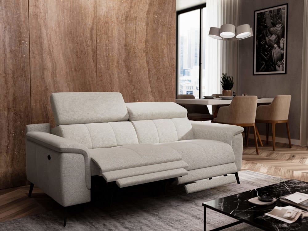 Sofa FIERO 3-Sitzer mit 2 Relaxfunktionen und verstellbare Kopfstützen, hellbeigeMaße: 212 x 103 x 82 cm, 114 kg. Sitzhöhe: 48 cm, Sitztiefe: 54 cm.Pakete: 2 St. Montage erforderlich.Füße: 16 cm, schwarz, Metall, Montage erforderlich.Funktionen: manuell verstellbare Kopfstützen.2 Relaxfunktionen Elektrische Relaxfunktion mit 2m Kabel zum Anschluss an die Steckdose. Gesteuert mit zwei Tasten – auf der Außenseite der Armlehne. Die Verstellung erfolgt leise und stufenlos: Die Rückenlehne bewegt sich leicht nach vorne, die Fußstütze hebt die Beine in eine waagerechte Position. Die gewünschte Position kann jederzeit gestoppt werden. Komfortabel für Personen jeder Körpergröße.Mittlere Weichheit (3/5): Ausgewogen – weder zu weich noch zu hart. Das Sofa verbindet Komfort mit Funktionalität. Die Sitzfläche ist elastisch und stabil, passt sich aber gleichzeitig der Körperform an. Es ist ein Kompromiss zwischen Komfort und Stützkraft, geeignet für den täglichen Gebrauch.Farbton: ecru, hellgrau, beige melange.Polsterstoff: Charaktervoll, vielschichtigfarblich nuanciert, mit Melange-Effekt, mit reicher Textur, Das Gewebe lebt vom Zusammenspiel verschiedenfarbiger Kett- und Schussfäden unterschiedlicher Stärke, enthält Chenillefäden, angenehm im Griff, pflegeleicht, strapazierfähig. Die Hauptfarbe ergibt sich jeweils aus einer Kombination kontrastierender Farbfacetten, wodurch ein vielschichtiger, dynamischer Gesamteindruck entsteht. 100% Polyester, 354 g/m2, 35.000 Martindale cycle.Aufgrund der manuellen Herstellung unserer Möbel und der Flexibilität der verwendeten Materialien können die tatsächlichen Abmessungen der Möbel um einige Zentimeter von den angegebenen Maßen abweichen. Bitte stellen Sie sicher, dass das bestellte Möbelstück durch die Durchgänge passt und dass die Lieferung ordnungsgemäß durchgeführt werden kann. Die Wahrnehmung von Farben ist individuell und hängt vom Licht und der Umgebung des Möbelstücks ab. Die auf verschiedenen Bildschirmen angezeigten Fotos der Möbelstücke können sich in der Farbe geringfügig voneinander und vom Original unterscheiden. Wenn Sie Zweifel hinsichtlich der Farbe oder der Textur des Stoffes haben, kontaktieren Sie uns bitte und bestellen Sie Stoffmuster.