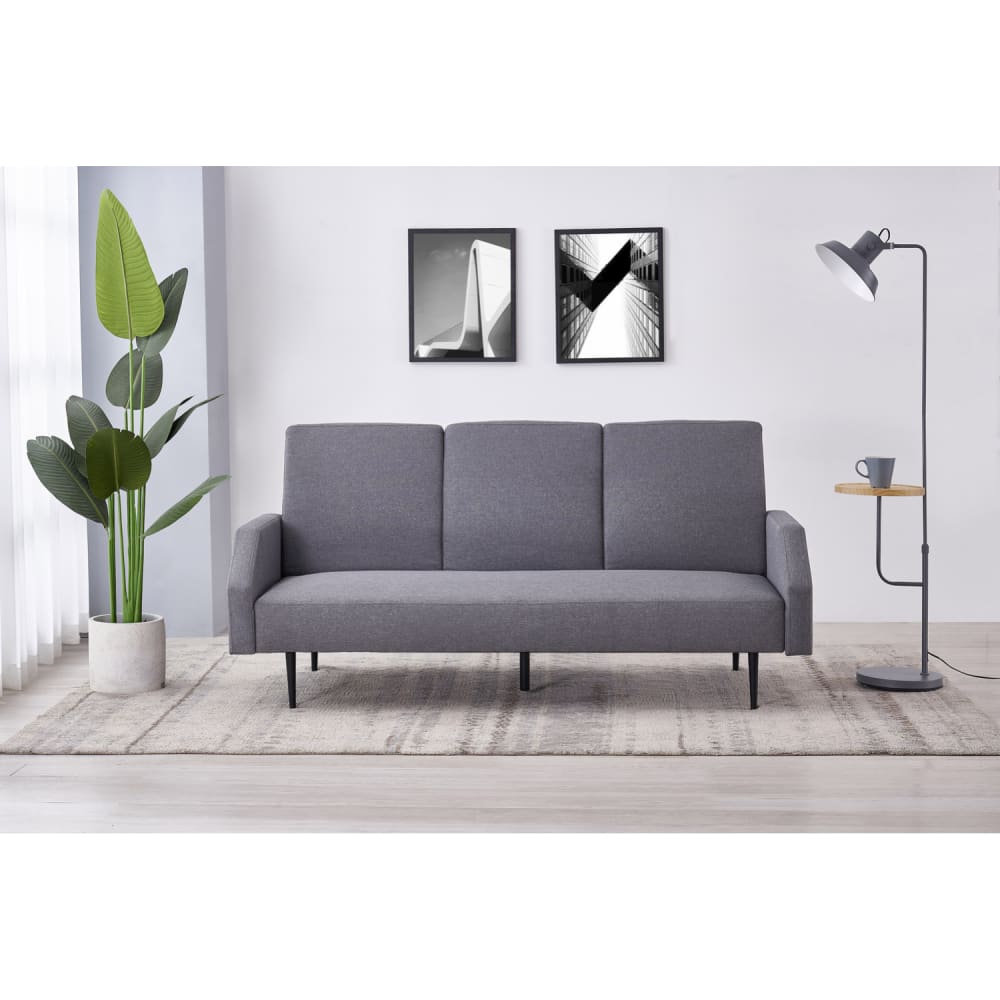 Technische MerkmaleHauptfarbe: GrauSitzplätze: 3Bezug: 100% PolyesterstoffStruktur: Massivholz (Eukalyptus) + SpanplattenFüße: MetallSitz: Eine untere Schicht aus 50 kg/m³ Schaumstoff und eine obere Schicht aus 25 kg/m³ Schaumstoff + Watte 150g/m²Federung: WellenfedernUmwandelbar: JaAbnehmbare Armlehnen: JaInklusive Kissen: Ja, 2Rückseite des Sofas: Schwarzer StoffMaximales Gewicht: 300 kgPflegeReinigen Sie das Sofa nur oberflächlich mit einem weichen, leicht feuchten Tuch, trocknen Sie es schnell mit einem Haartrockner und führen Sie immer einen Vorabtest an einer unauffälligen Stelle durch. Verwenden Sie keine Lösungsmittel. Um Staub zu entfernen, verwenden Sie am besten einen Staubsauger.AbmessungenGesamt (B x T x H): 184 x 86 x 88 cmAbmessungen der Liegefläche (mit Armlehnen): 184 x 113 x 38 cmAbmessungen der Liegefläche (ohne Armlehnen): 163 x 113 x 38 cmHöhe des Fußes: 20 cmSitzhöhe: 40 cmSitztiefe: 56 cmSitzpolsterstärke: 20 cmAbmessungen der Armlehnen: 72 x 8,5 x 38 cmVerpackungDie Zubehörteile (Füße und Armlehnen) befinden sich unter dem Sofa.Das Produkt wird in einem Paket von 166 x 115 x 21 cm / 42 kg verpackt.Einfacher Aufbau, eine Anleitung liegt bei.