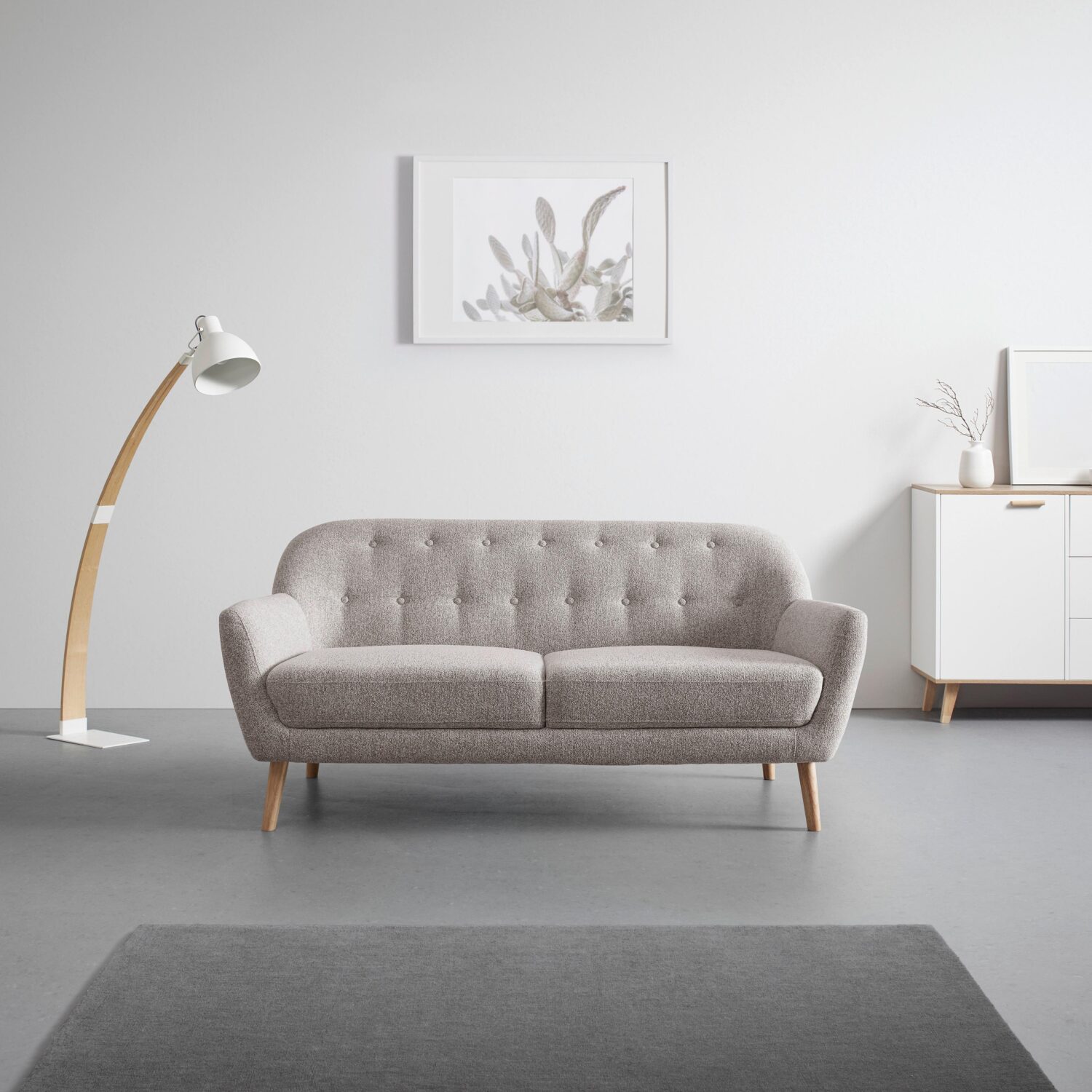 Gönnen Sie sich doch etwas Entspannung mit diesem Sofa in Beige, das mit seiner harmonischen Optik ein schicker Blickfang für Ihr Zuhause ist. Die abgerundete Rückenlehne mit dekorativen Knöpfen verleiht dem ca. 170 x 78 x 86 cm (B x H x T) großen zweisitzigen Sofa eine ansprechende Note. Besonders schön sind die konischen Füße aus hellem Holz, die dem bis max. 240 kg belastbaren Sofa die optimale Standfestigkeit geben. Dank Wellenunterfederung und einem mit Schaumstoff gepolsterten Sitzkissen mit einer Größe von ca. 58 x 25 x 79 cm (B x H x T) sitzen Sie jederzeit bequem. Das Sofa hat eine Sitztiefe von ca. 59 cm. HINWEIS Dieser Artikel wird in unseren Filialen nicht ausgestellt, ist dort jedoch einfach und bequem bestellbar und wird direkt zu Ihnen nach Hause geliefert. Bitte beachten Sie, dass die abgebildete Dekoration im Lieferumfang nicht enthalten ist.