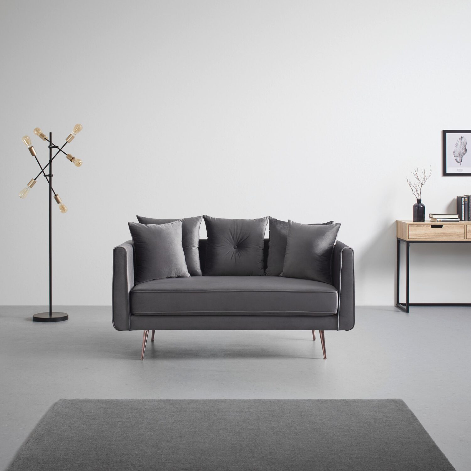 Dieses Sofa in Grau bietet Ihnen Entspannung pur. Der anschmiegsam weiche Samtbezug aus 100 % Polyester sieht nicht nur sehr edel aus, sondern ist auch besonders gemütlich und bequem. Das ca. 155 x 87 x 87 cm (B x H x T) große Sofa ist außerdem mit weichen Kissen, die mit Komfortschaum gefüllt sind, ausgestattet. Die ca. 12 cm breiten Armlehnen laden zum gemütlichen Verweilen ein. Darüber hinaus punktet das Sofa mit einem Innenleben aus Gurtfederung, Wellenunterfederung, Taschenfederkern und Schaumstoffpolsterung. Besonders schön sind die Füße aus rosa-goldfarbenem Rundrohr. Ein rundum gelungenes Sofa mit Platz für bis zu 2 Personen. Das wird garantiert Ihr neuer Lieblingsplatz!