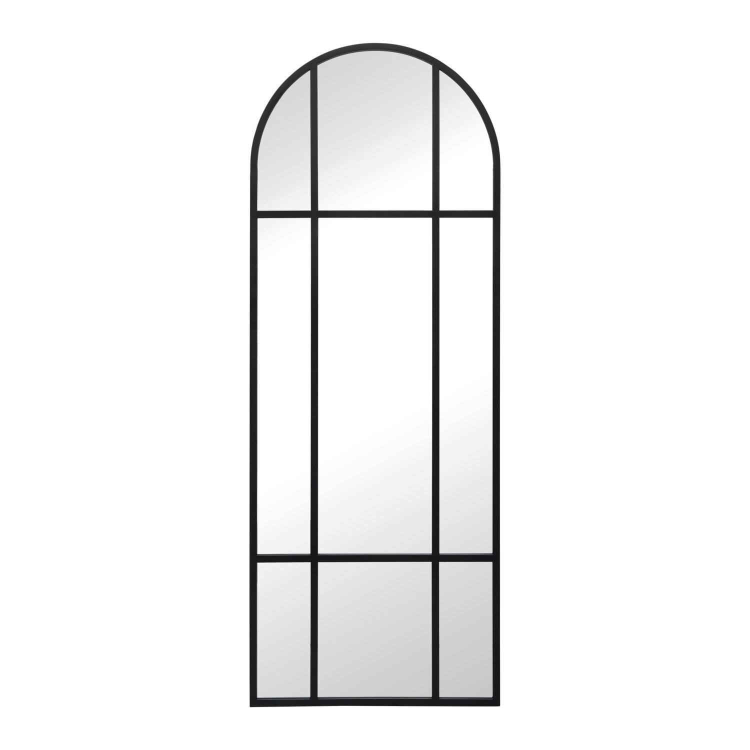 Stilvolle Eleganz strahlt dieser Spiegel mit Metallrahmen in Schwarz aus. Der an ein Fenster erinnernde Wandspiegel mit abgerundeter Optik ist ein garantierter Hingucker für viele Wohnbereiche. Mit den Abmessungen von ca. 70 x 185 x 3 cm (B x H x T) verfügt der Spiegel mit Rückenplatte aus Holzdekor auch über eine stattliche Größe. Der Spiegel ist mittels Schrauben zur Wandmontage geeignet. HINWEIS Dieser Artikel wird in unseren Filialen nicht ausgestellt, ist dort jedoch einfach und bequem bestellbar und wird direkt zu Ihnen nach Hause geliefert. Bitte beachten Sie, dass die abgebildete Dekoration im Lieferumfang nicht enthalten ist.