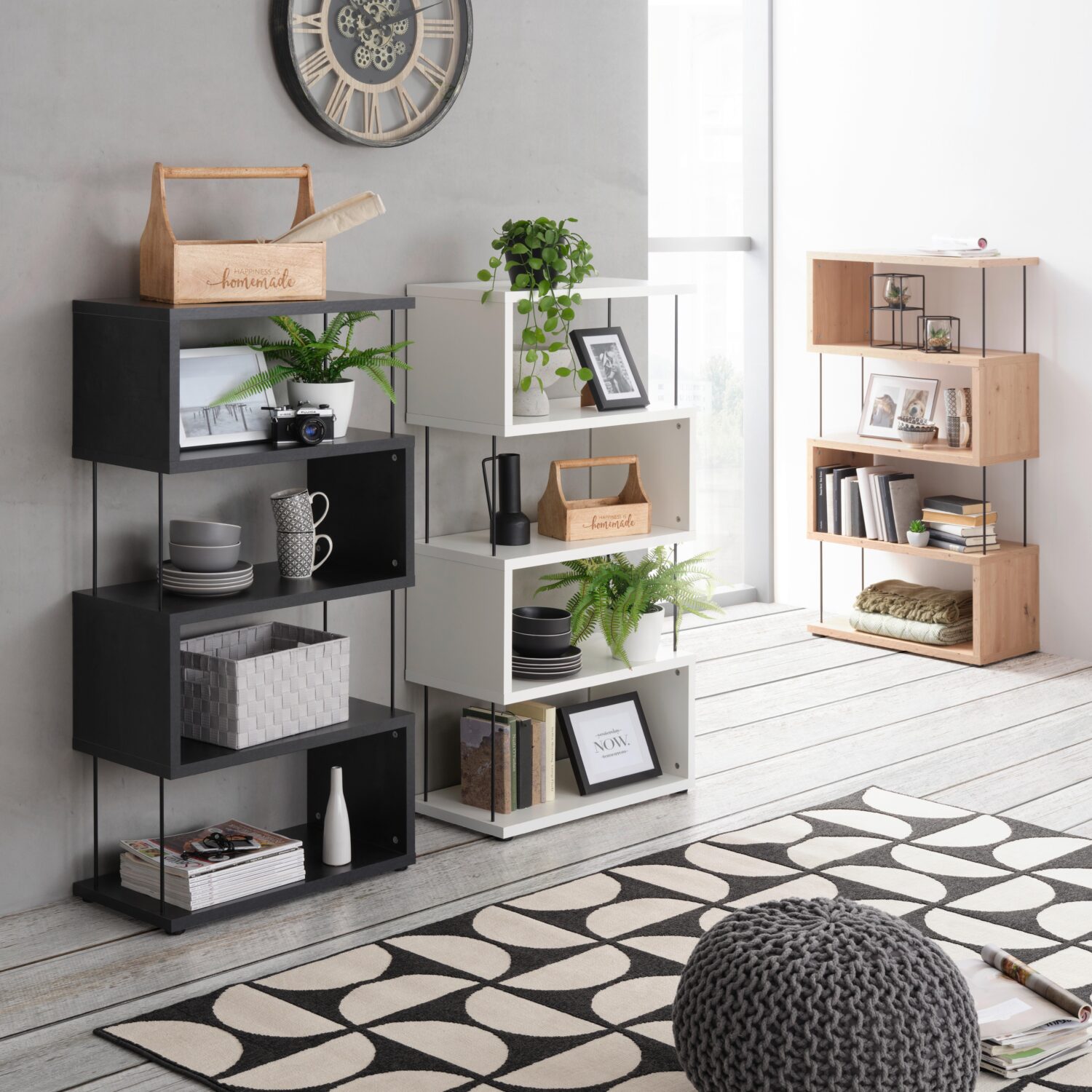 Dieses tolle Standregal in Schwarzstahl punktet mit einer attraktiven S-förmigen Optik, die es zu einem sicheren Hingucker in Ihrem Zuhause macht. Das ca. 66 x 126 x 33 cm (B x H x T) große Standregal aus Holz-Dekor verfügt über 4 offene Fächer, die Ihnen viel Spielraum zur individuellen Gestaltung bieten. Zudem kann die Oberfläche mit einer Melaminharzbeschichtung punkten. Stäbe in Schwarz verleihen dem Standregal im Industry-Stil einen ganz besonderen Look. HINWEIS Bitte beachten Sie, dass die abgebildete Dekoration im Lieferumfang nicht enthalten ist.