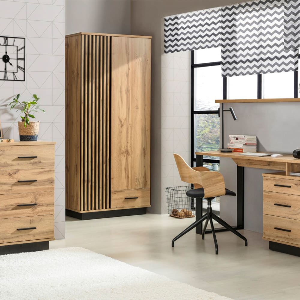 – Kunststoffgriffe in schwarz- ohne Beleuchtung- Front mit dekorativen Lamellen- 2 Türen, innen 1 Boden & 1 Kleiderstange- 1 Schublade- Belastbarkeit der Schublade: 3kg- Belastbarkeit der Kleiderstange: 15kg- Belastbarkeit vom Einlegeboden: 7kg- B/T/H: 90cm / 52cm / 193cm