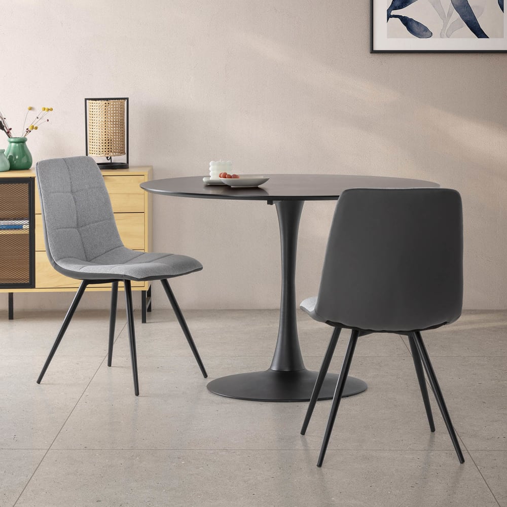 · Diese Esszimmerstühle sind mit einem Stoff gepolstert, der zu 50 % aus Polyester und zu 50 % aus Kunstleder besteht. Sie verfügen über Metallbeine mit schwarzer elektrostatischer Lackierung und Kunststoffnoppen, die ein Verkratzen des Bodens verhindern.