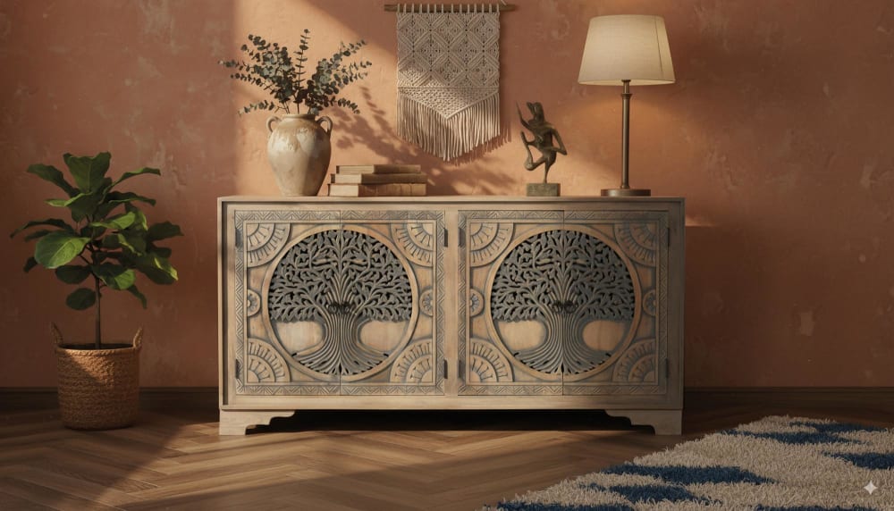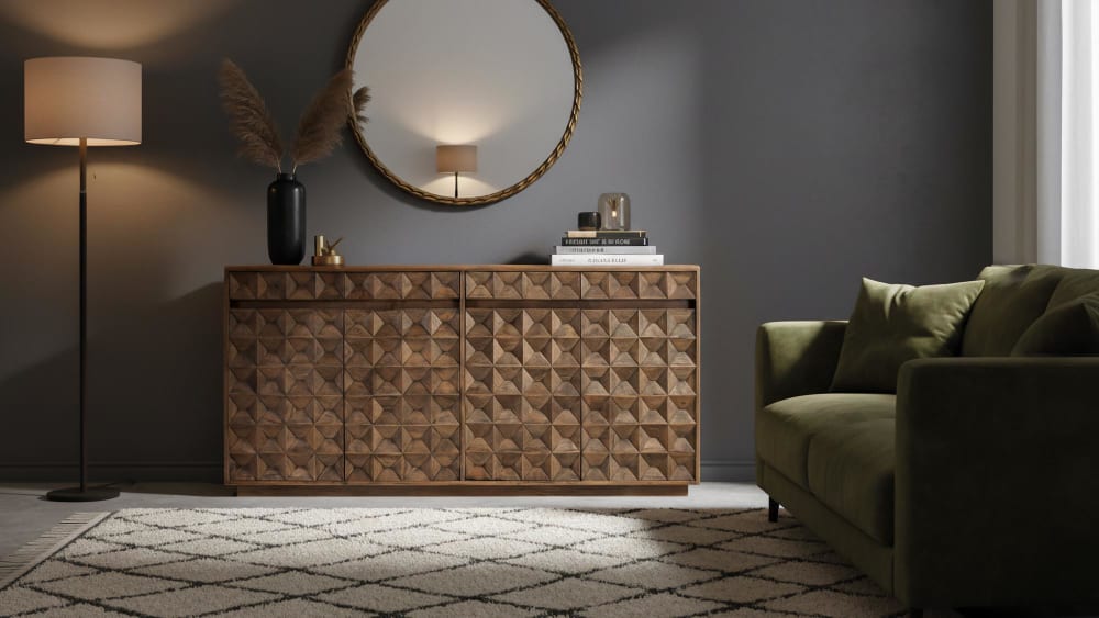 Sideboard aus Mangoholz mit zwei handgeschnitzten Seitentüren 150x80x40cm Holz Grau GINER Y COLOMER Möbel Esszimmermöbel Sideboards, Highboards & niedrige Anrichten