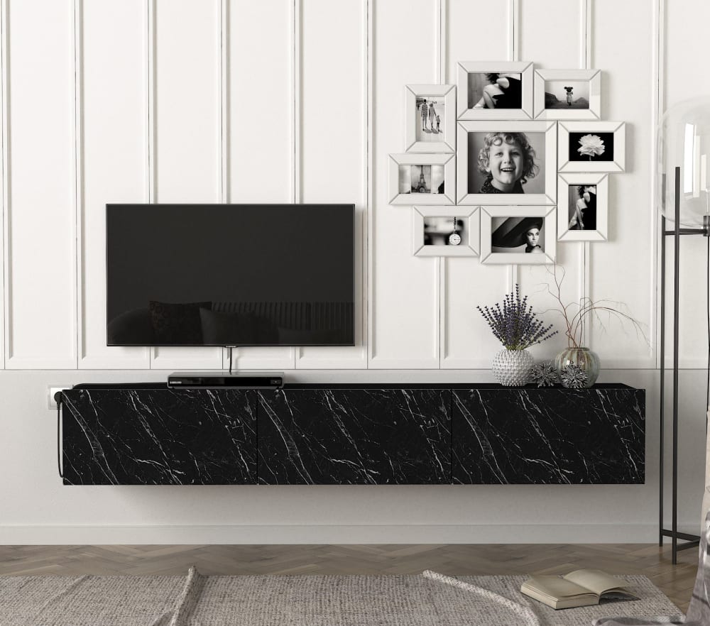 TV-Möbel 3-Türig Holz hängend Schwarz Marmoroptik 30x30x180cm Spanplatte Schwarz moebel17 Möbel Wohnzimmermöbel TV-Möbel