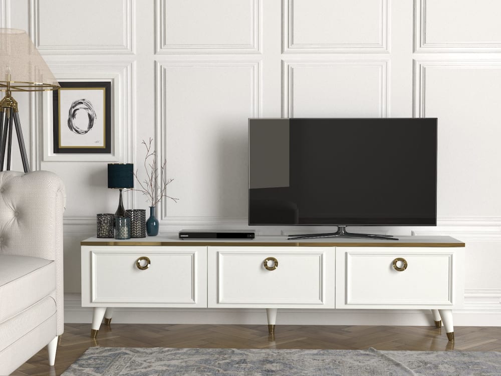 TV-Möbel 3-Türig Holz Weiß mit goldenen Verzierungen 35x46x180cm Spanplatte Weiß moebel17 Möbel Wohnzimmermöbel TV-Möbel
