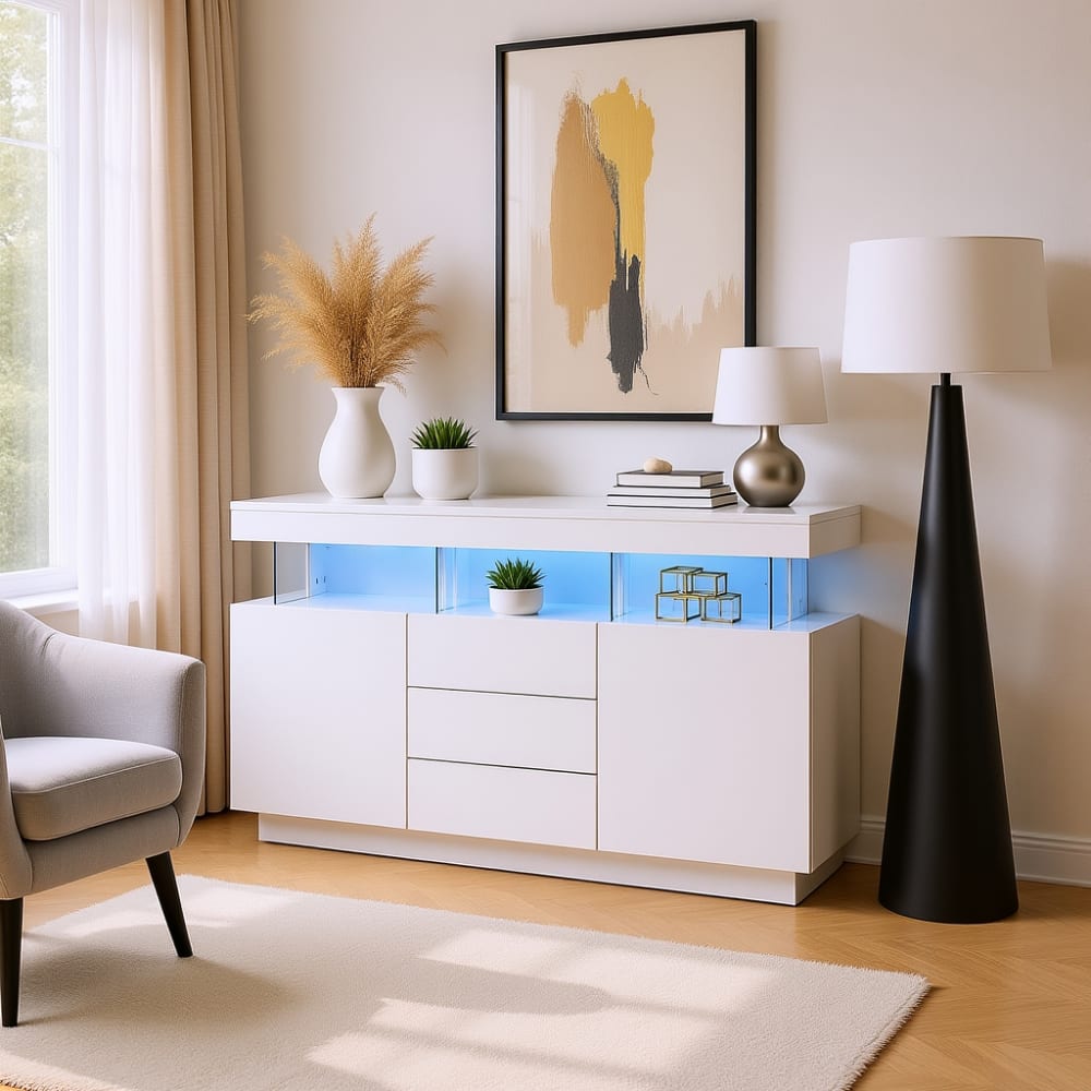 Weiße Designer-LED-Konsole mit Stauraum und Schubladen 140x80x35cm Spanplatte Weiß Urban Meuble Möbel Wohnzimmermöbel Konsolentische