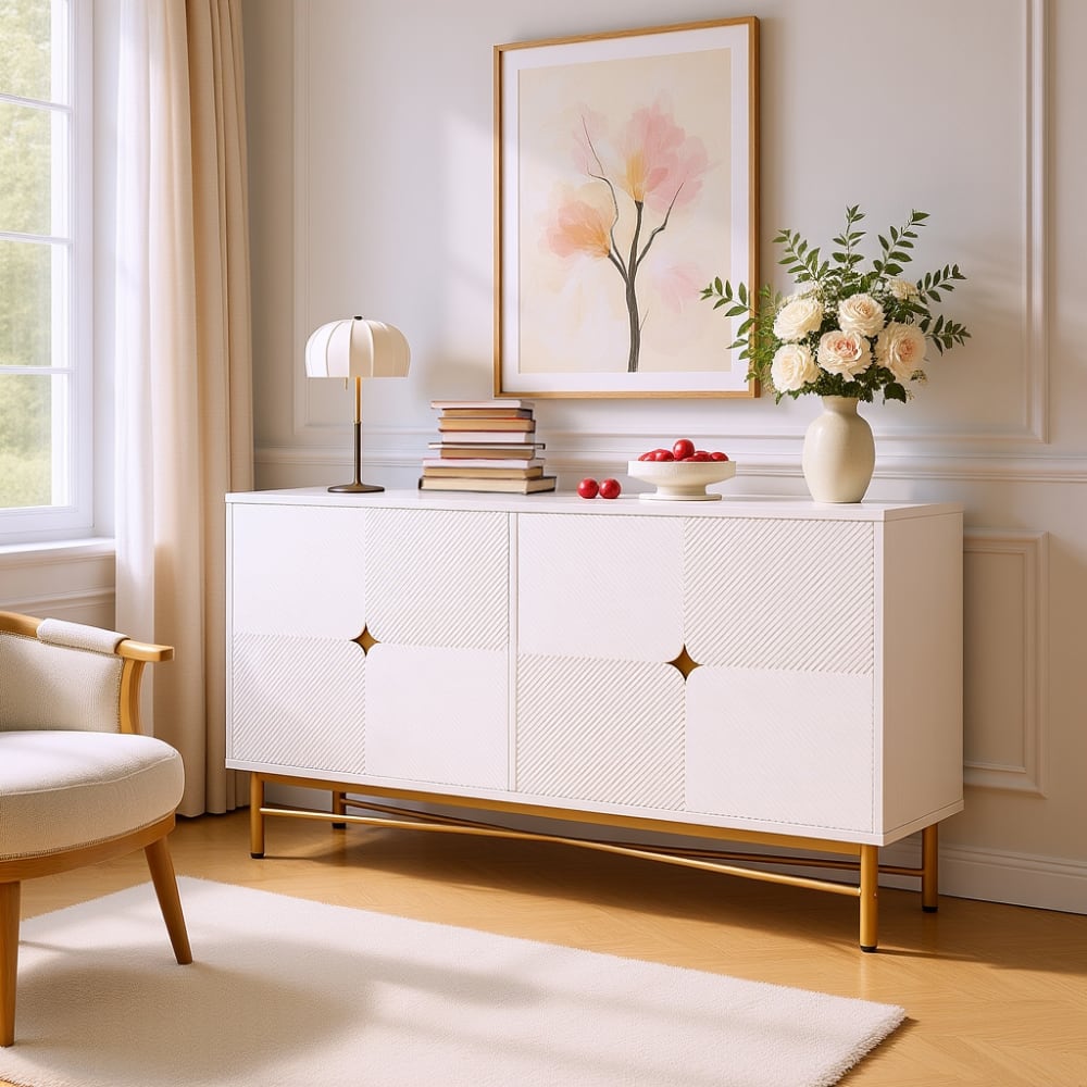 Weiße Konsole mit goldenem Design und Stauraum 160x82x40cm Spanplatte Weiß Urban Meuble Möbel Wohnzimmermöbel Konsolentische