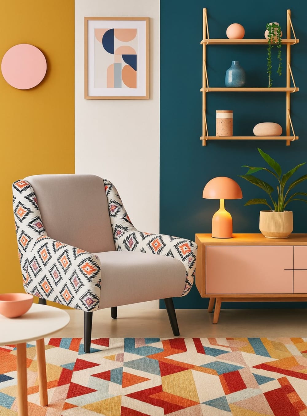 Zweifarbiger Retro-Sessel aus Stoff mit ethnischen Motiven 85x81x72cm Stoff Weiß Mathi Design Sofas und Sessel Sessel, Poufs und Fußbänke Sessel