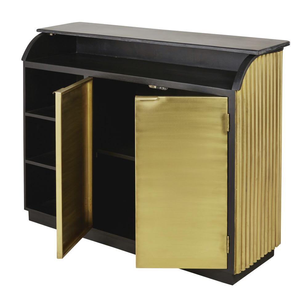 Verlassen Sie sich auf den Tresentisch für gewerbliche Nutzung aus gewelltem Metall und schwarzem LOUXOR BUSINESS, um Ihre Kundschaft zu beeindrucken. Sein schickes kühnes Design birgt viele Überraschungen, während die abgerundete Form eine gesellige Atmosphäre aufkommen lässt. Ergänzt wird der Vintage-Tresentisch mit einem Korpus aus schwarzem Mangoholz, 2 Türen aus messingfarbenem galvanisiertem Metall und einer schwarzen Marmorplatte. Der Stauraum überzeugt mit 3 festen Einlegeböden aus Mangoholz zum Aufbewahren von Gläsern und Karaffen. Dieses Möbelstück passt perfekt in eine raffinierte Bar, ein schickes Restaurant oder eine Hotelsuite. Was sagen Sie dazu?