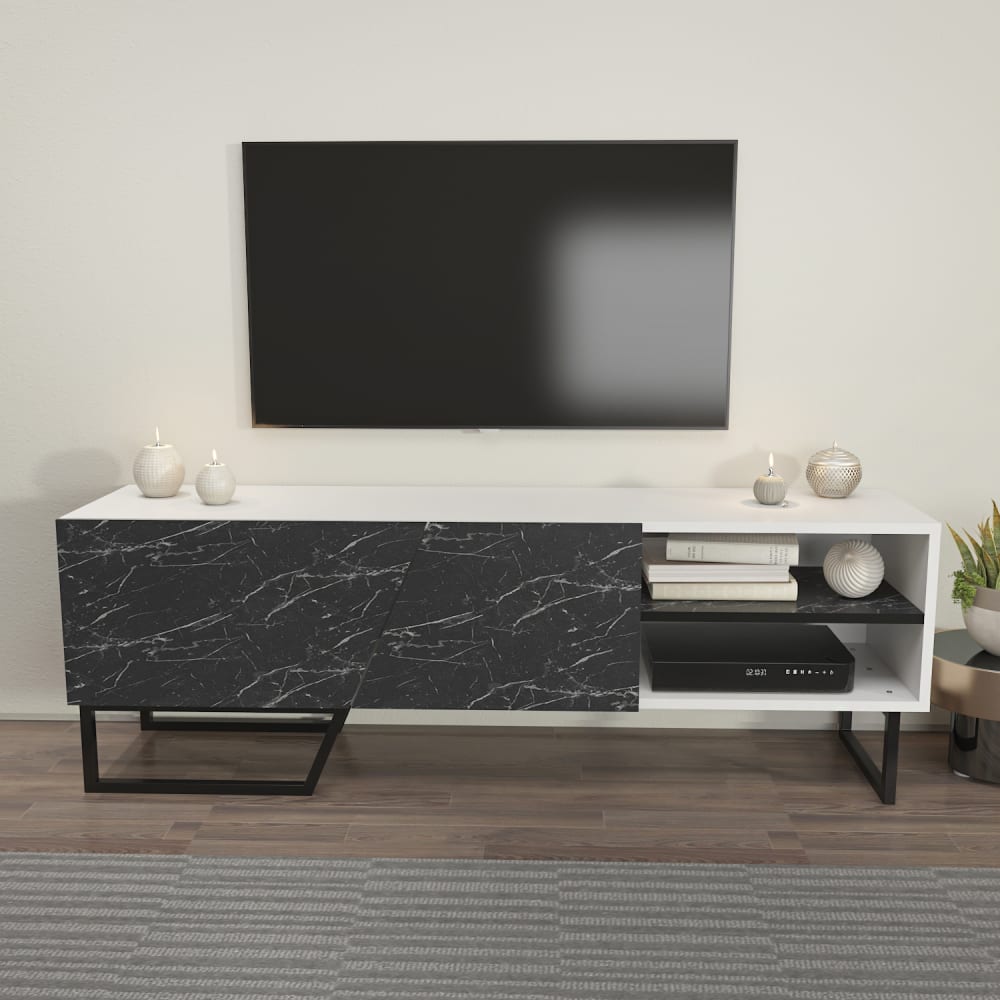 TV Lowboard mit 2 Türen, weiß und schwarzer Marmor 150 cm von Decorotika