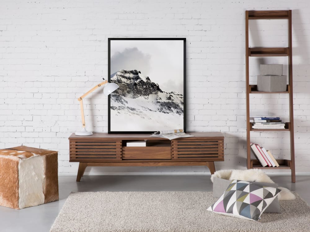 Schmaler TV-Schrank mit Schublade und 2 Schiebetüren in edler Lamellenoptik. Dieser Fernsehschrank zeichnet sich mit seinem ausgefallenen Design aus und überzeugt sowohl durch seinen dunklen Wallnussfarbton als auch seine natürliche Ausstrahlung. Er hat rechts und links zwei Fächer mit Schiebetüren und in der Mitte eine geräumige Schublade. Hierdurch werden Ihnen ungeahnte Stauraummöglichkeiten geboten. Die Leisten, welche in kleinen Abständen an den Schiebetüren angebracht sind, geben dem Fernsehschrank einen offenen Charakter.Details: Typ: TV-Möbel Stil: Rustikal Farbe: Dunkler Holzfarbton Material: Faserplatte Gestellmaterial: Holzwerkstoff Tischplattenmaterial: Holzwerkstoff Anzahl Einlegeböden: 5 Türöffnungsarten: Schiebetür Finish: Laminiert Türanzahl: 2 Schubladen: 1 Abmessungen: Tiefe: 35 cm Breite: 149 cm Höhe: 44 cm Gewicht: 25 kg Max. Belastung der Schublade: 21 kg Max. Belastung pro Fach: 5 kg Max. Belastung der Oberplatte: 50 kg Sie kaufen: 1 x TV-Möbel Produktvorteile:Mit praktischer Kabeldurchführung, Unterschiedliche Stauraummöglichkeiten, Zeitloses Design, Präzise ausgearbeitete Details, Rutschfester Stand Montage: Nicht montiert. 20 – 40 Min. Zusatzinformationen: Um die Haltbarkeit und die Ästhetik der Arbeitsplatte zu erhalten, sollte man Platzsets und Untersetzer verwenden und feuchte Stellen schnellstmöglich trocken wischen, um Produktschäden zu vermeiden. Pflegeanleitung: Faserplatte: 1.Bitte ausschließlich milde Reinigungsmittel und weiche Tücher verwenden. Feuchte Stellen sofort trocken reiben.