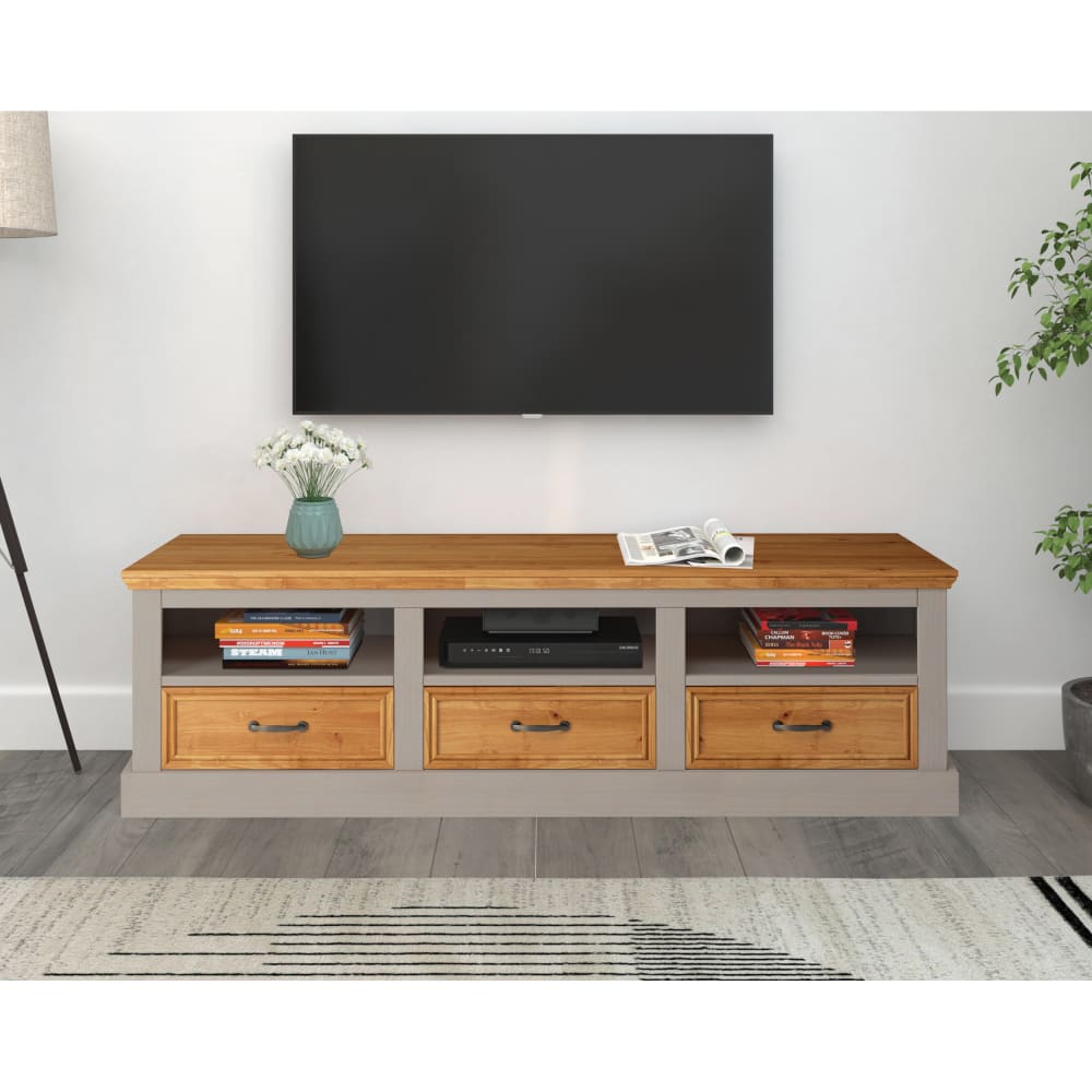 Der praktische und schöne TV-Ständer sieht einfach großartig aus! Er hat einen modernen Landhausstil und ist aus hochwertigem FSC-zertifiziertem massivem Kiefernholz gefertigt. Es wurde darauf geachtet, dass die Holzstruktur und die Knoten sichtbar bleiben. Die Schubladen des TV-Ständers sind mit Griffen aus antikisiertem Metall ausgestattet. Sie unterstreichen das rustikale Erscheinungsbild und sorgen gleichzeitig für eine einfache Öffnung. Die Metallschienen und -scharniere sind besonders stabil. Er passt in jeden Raum und bereichert mühelos das Ambiente.
