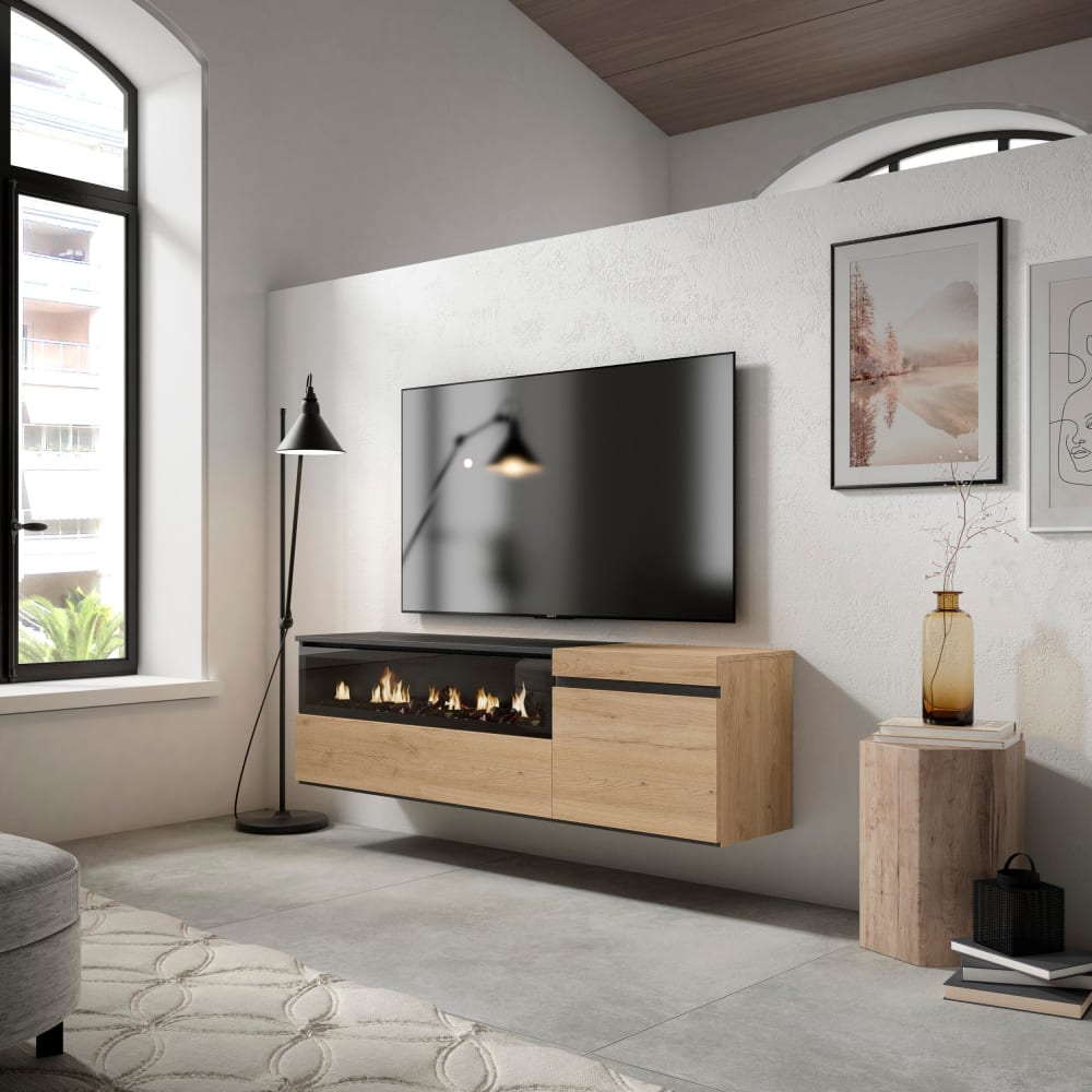 TV-Möbel Holzeffekt Kamin mit Feuereffekt 150x35x45 Eiche und Schwarz 150x45x35cm Spanplatte Beige Skraut home Möbel Wohnzimmermöbel TV-Möbel