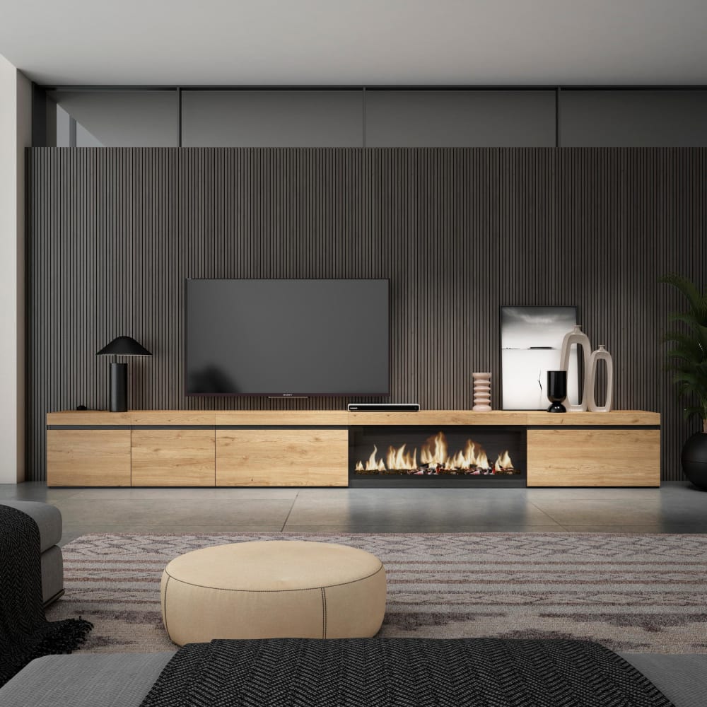 TV-Möbel Holzeffekt Kamin mit Feuereffekt XXL 368x35x45cm Eiche 368x45x35cm Spanplatte Beige Skraut home Möbel Wohnzimmermöbel TV-Möbel