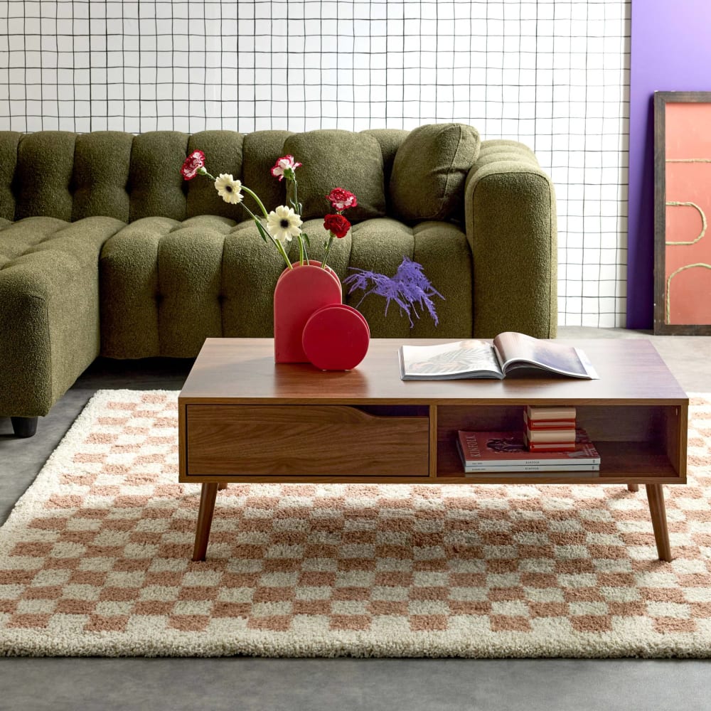 Seine Nussbaumfarbe wird Ihrem Wohnzimmer eine natürliche Wärme verleihen. Sein skandinavisches Vintage-Design wird Sie sofort begeistern, denn seine Zirkelbeine aus Kiefernholz und seine Schublade mit Einkerbung verleihen ihm einen wohldosierten Hauch von Eleganz.